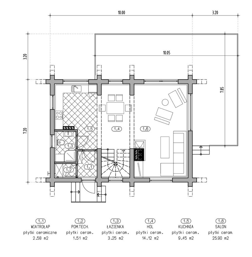 Wiatrołap, pom. techniczne, łazienka, hol, kuchnia z jadalnią, przestronny salon z dużym oknem